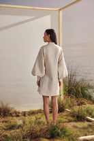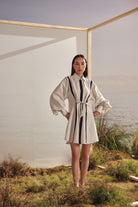 Linen shirt dress. Button down dress, balloon sleeves, concealed placket, knot at the waist for a cinched waist and a flattering silhouette.