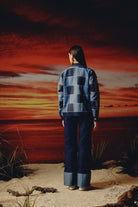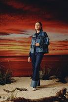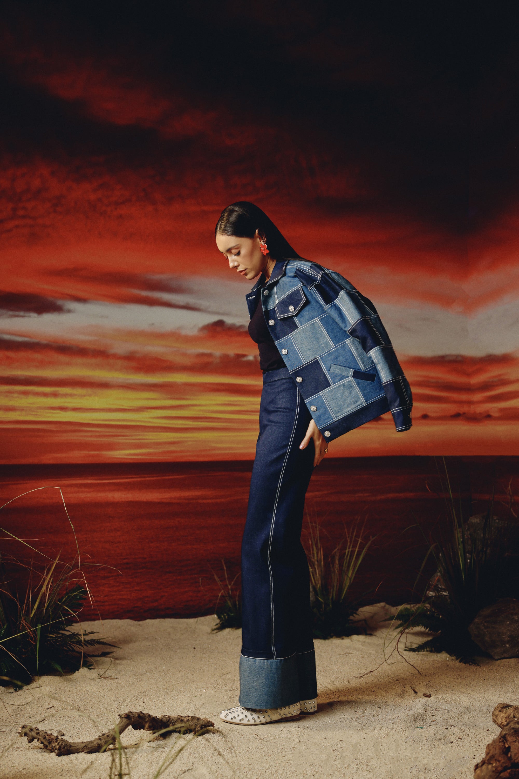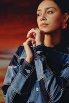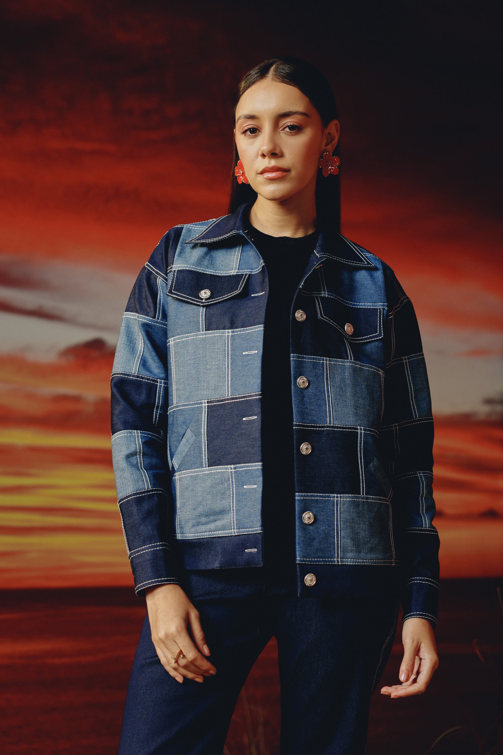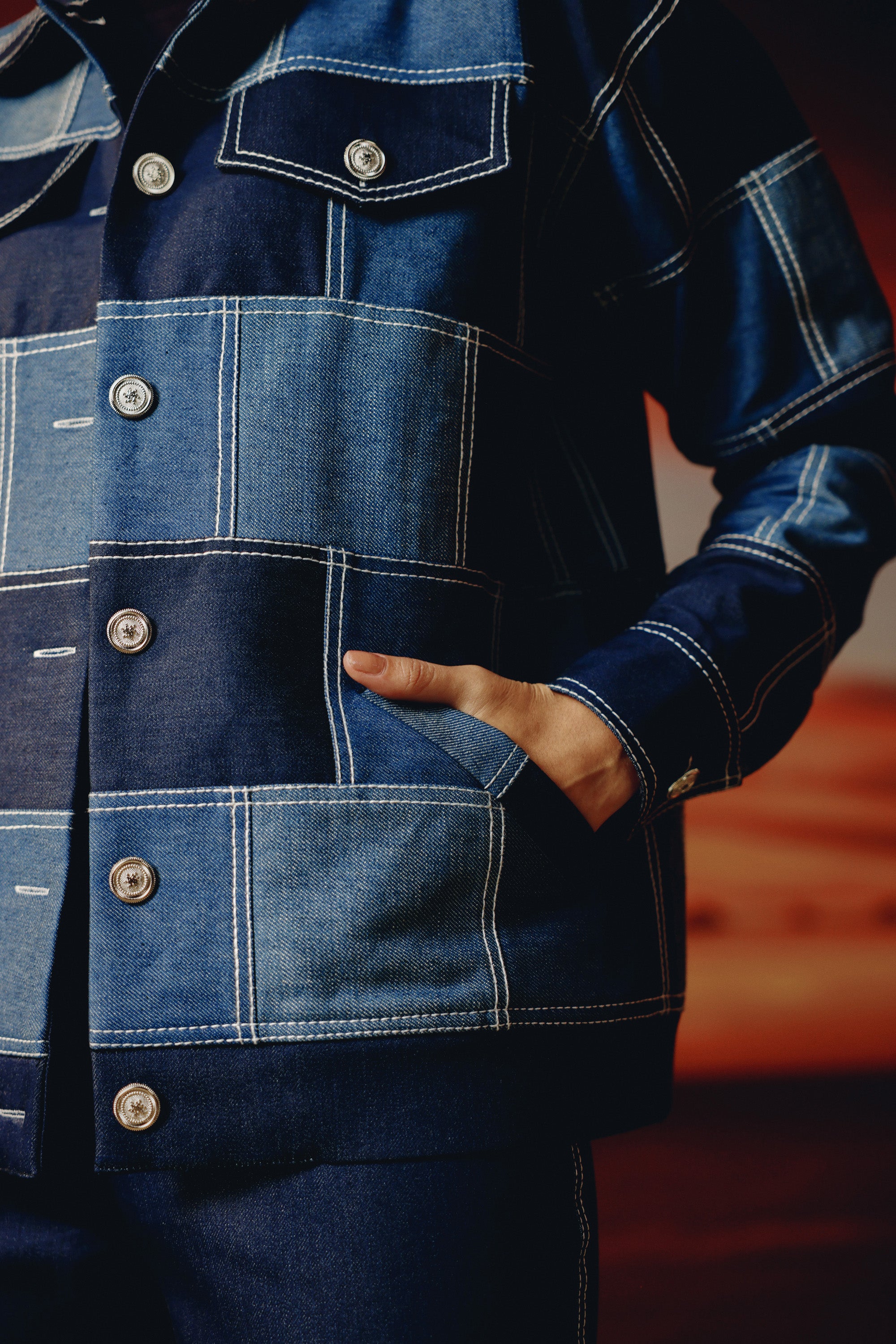 Denim patchwork jacket, drop shoulders, slightly loose fit - Functional pockets..Flaps for added style - embellished with silver buttons. Timeless denim trousers folded at the hem for a polished look.