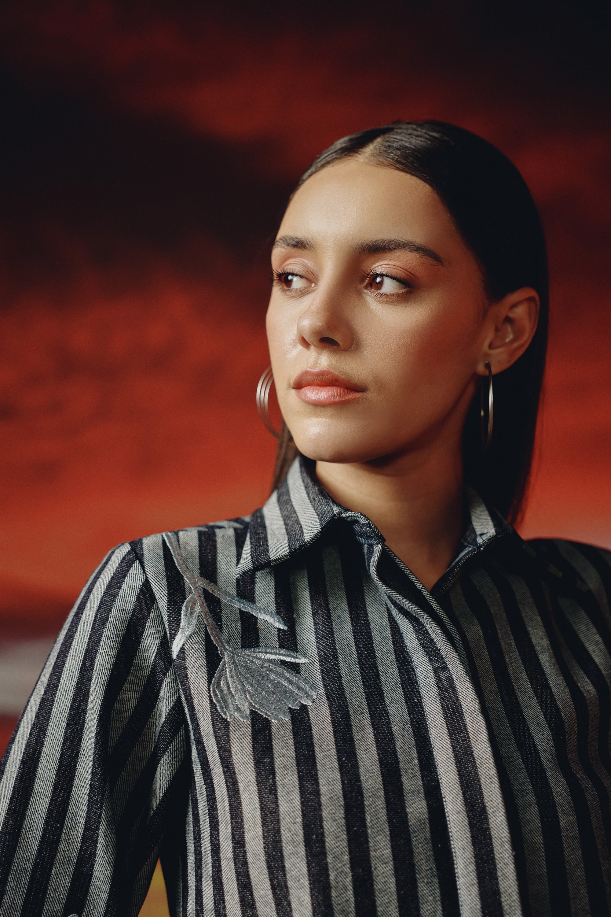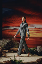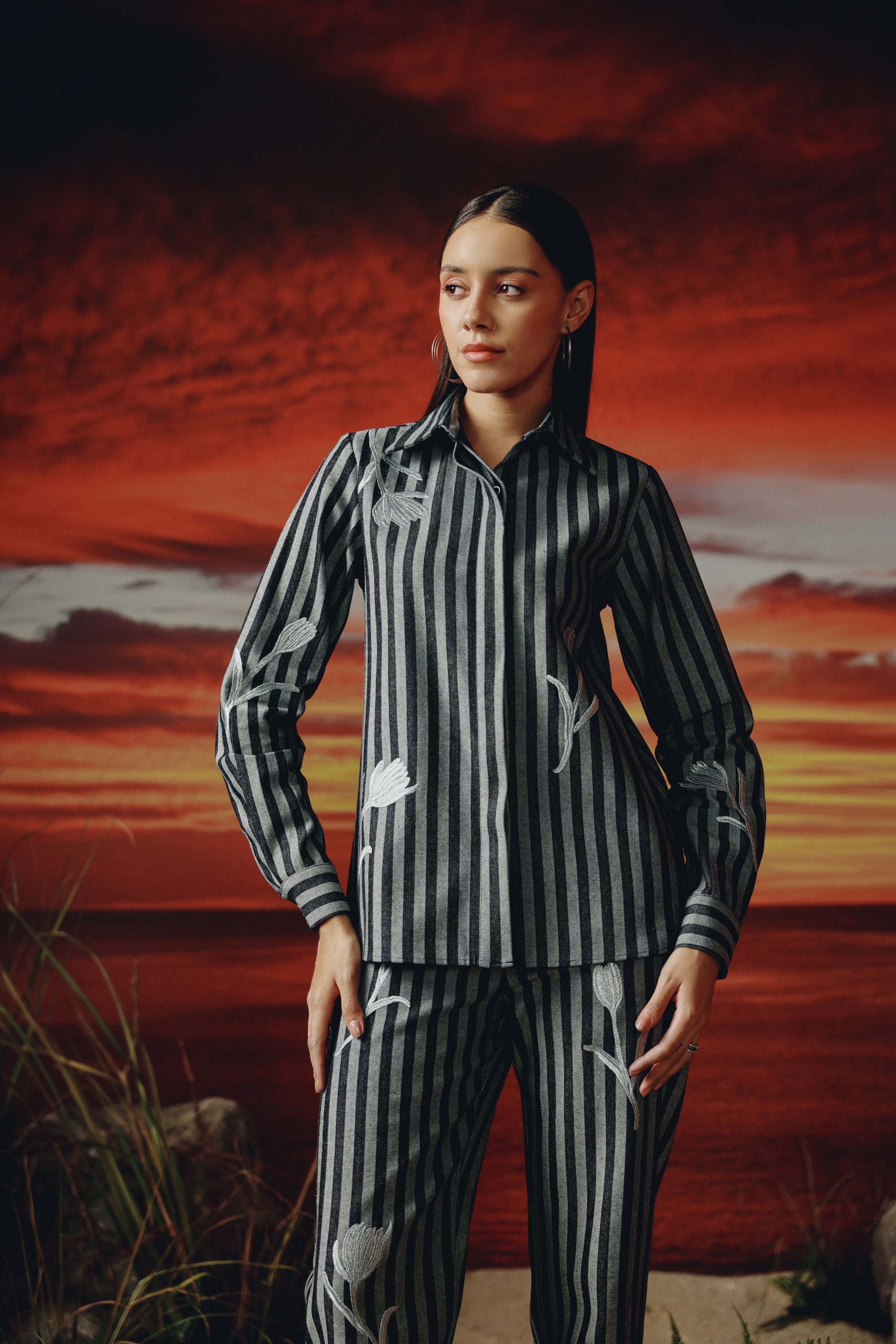 Button down denim shirt -elegant embroidery with silver lurex threads on the shirt and sleeves -concealed placket. Straight fit denim trousers -hook and zip closure -elegant embroidery with silver lurex threads.