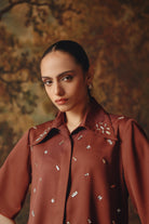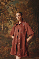 Premium crepe shirt dress embellished with stones. Button down dress, hand embellished with rhinestones, concealed placket and relaxed fit
