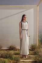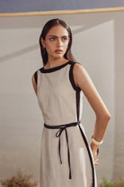 Linen boat neck midi dress with belt. Cinched at the waist for a flattering silhouette, boat neck and concealed zipper closure at the back.