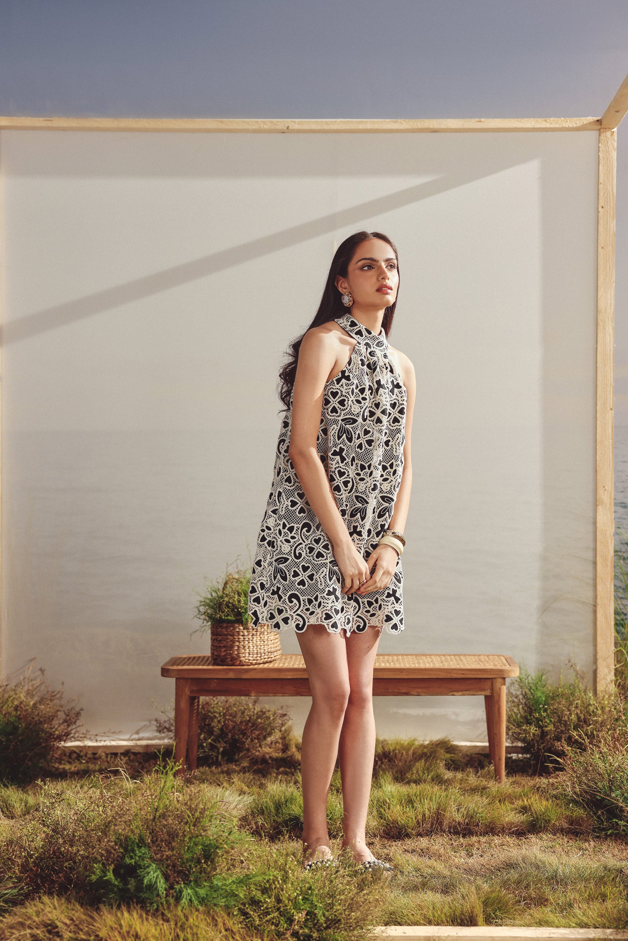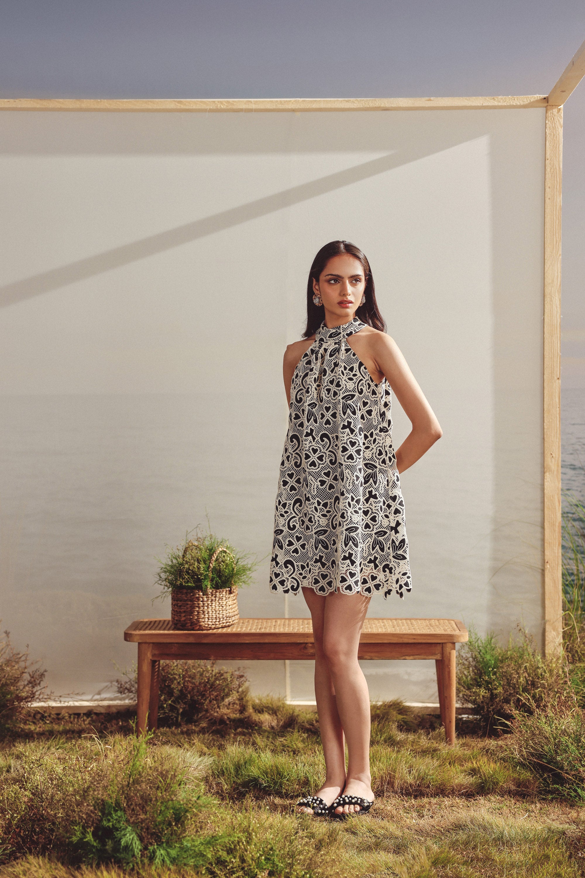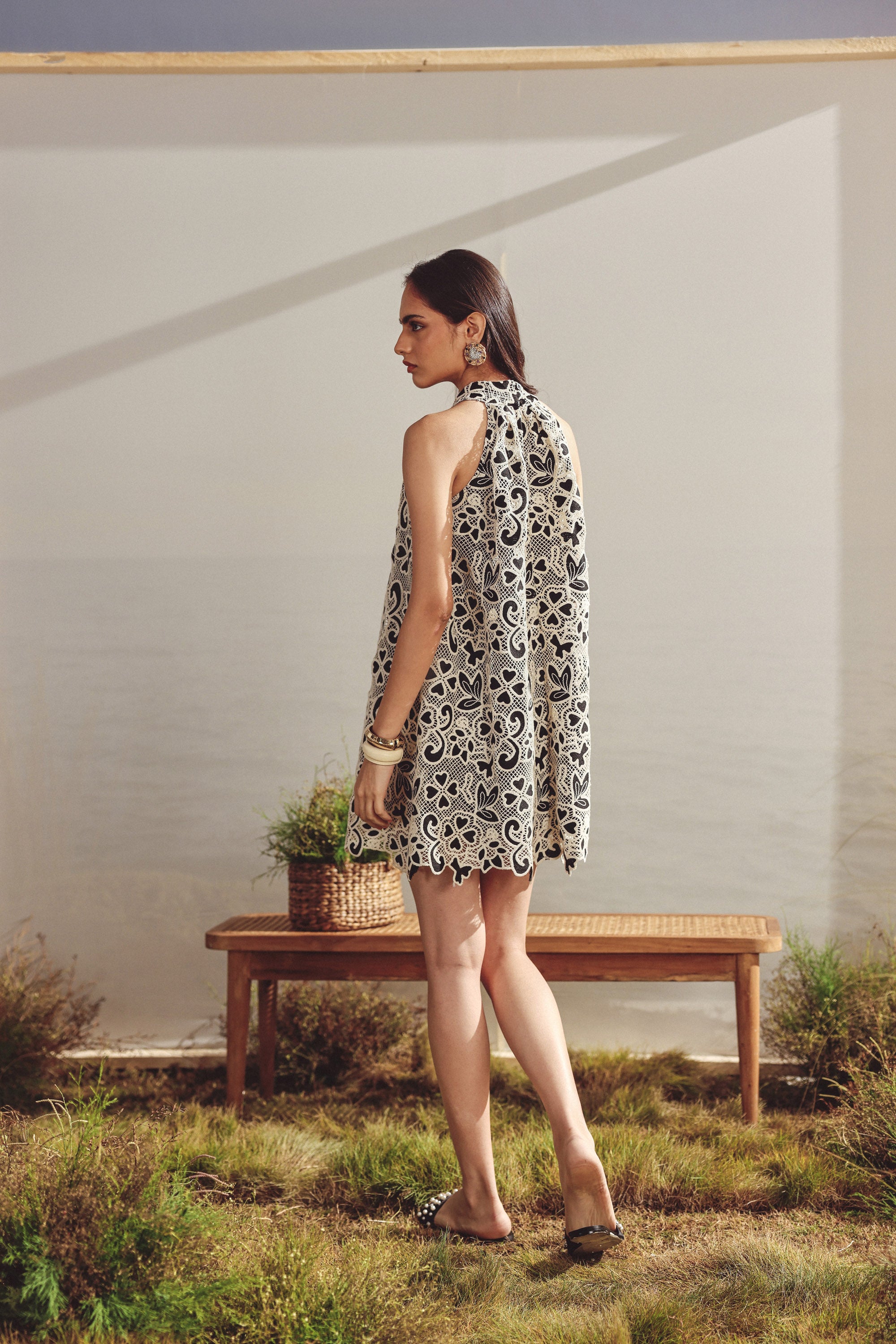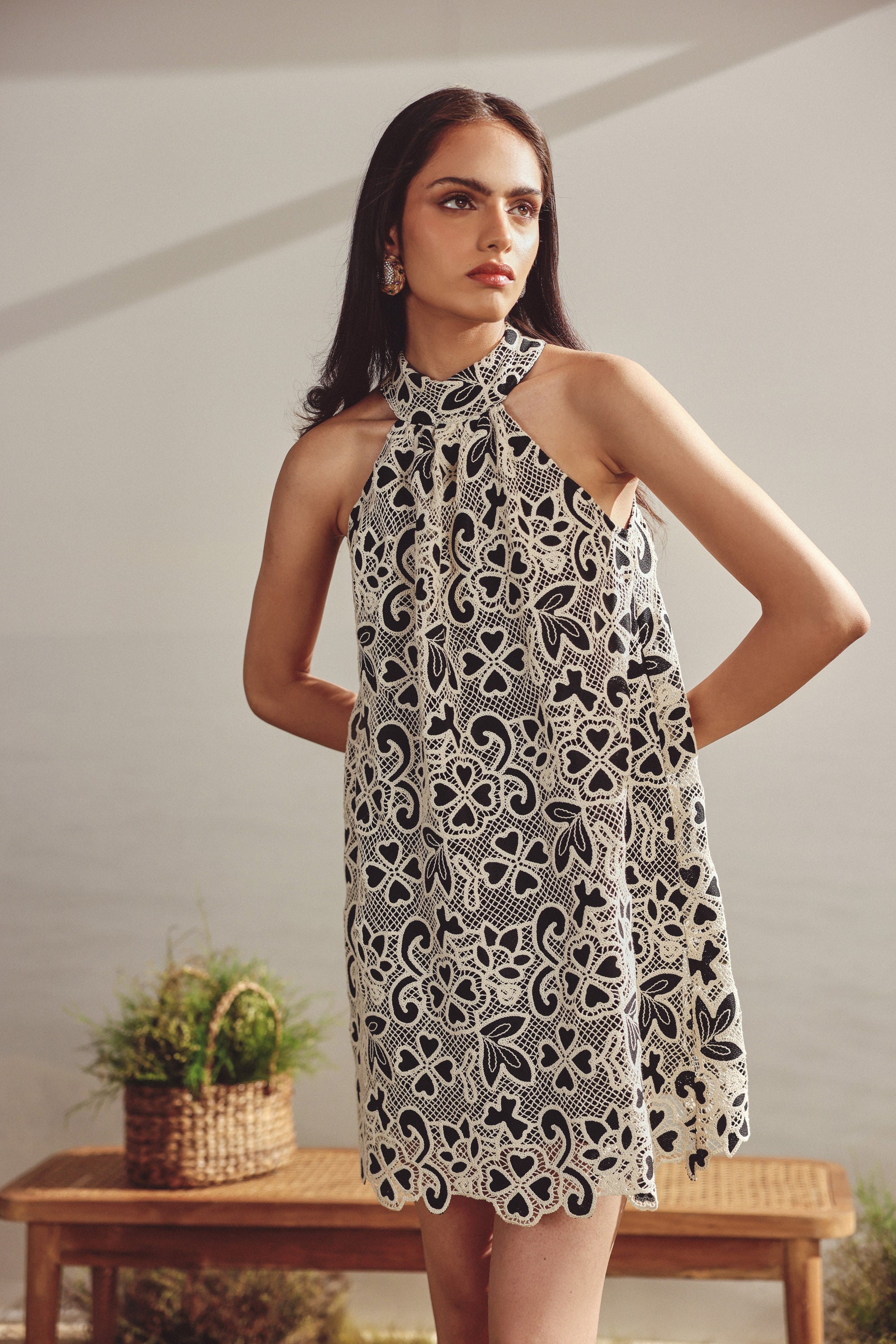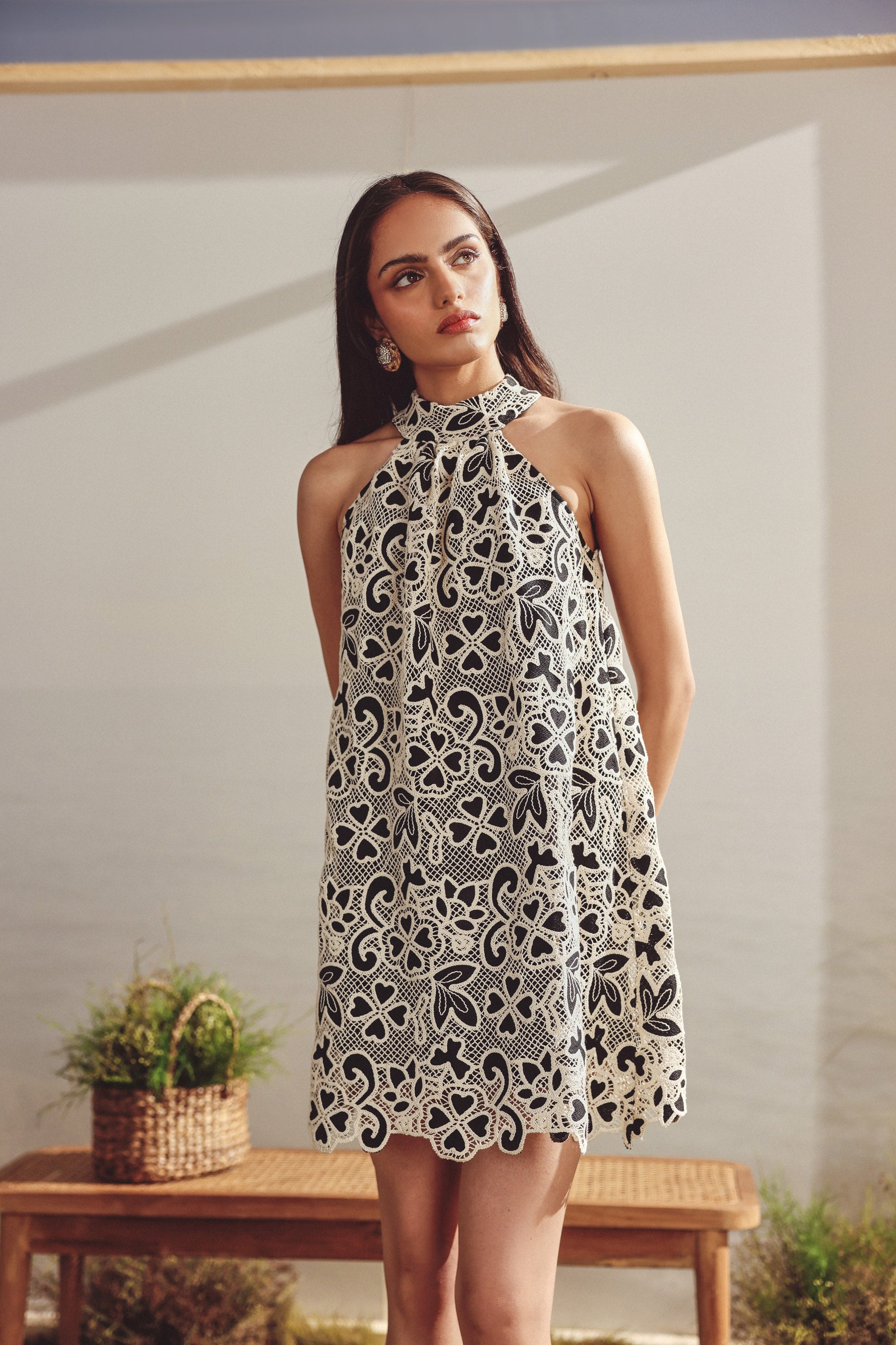 Lace halter neck short dress. Lace overlay -fully lined, halter neck, cut work at the hem, back button closure, fit and flare silhouette