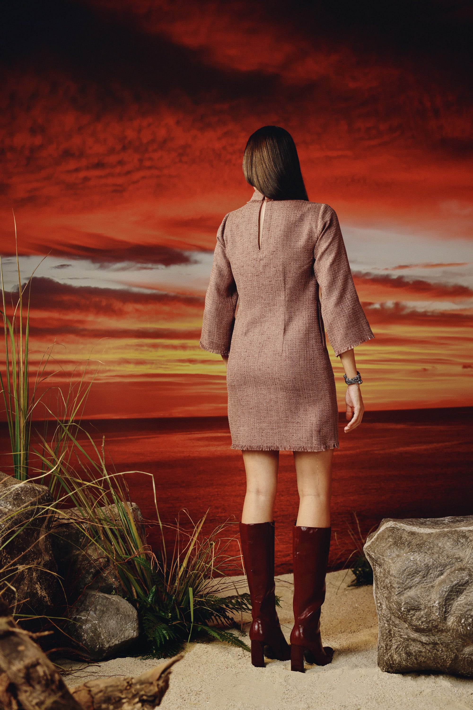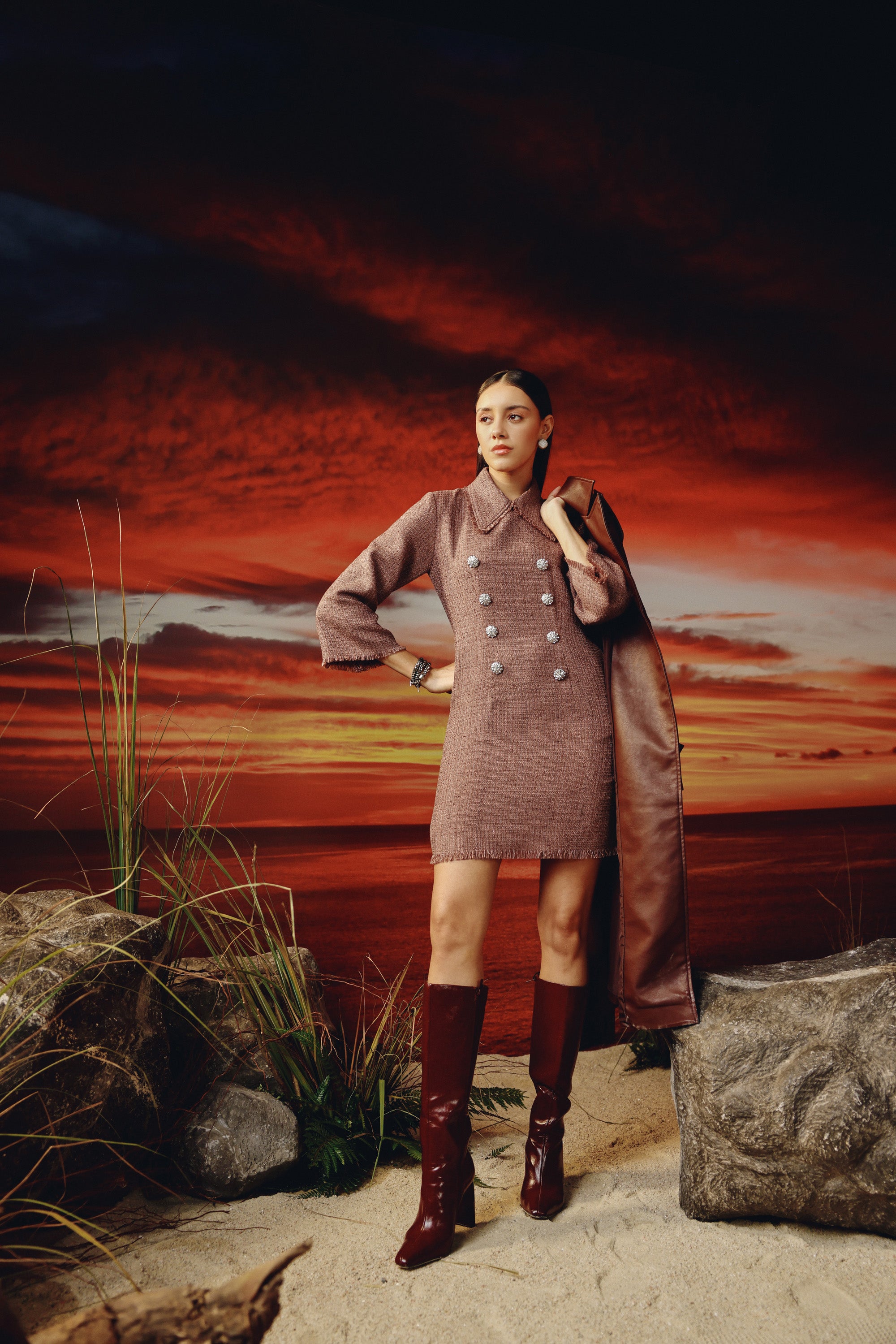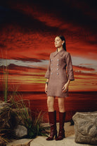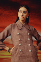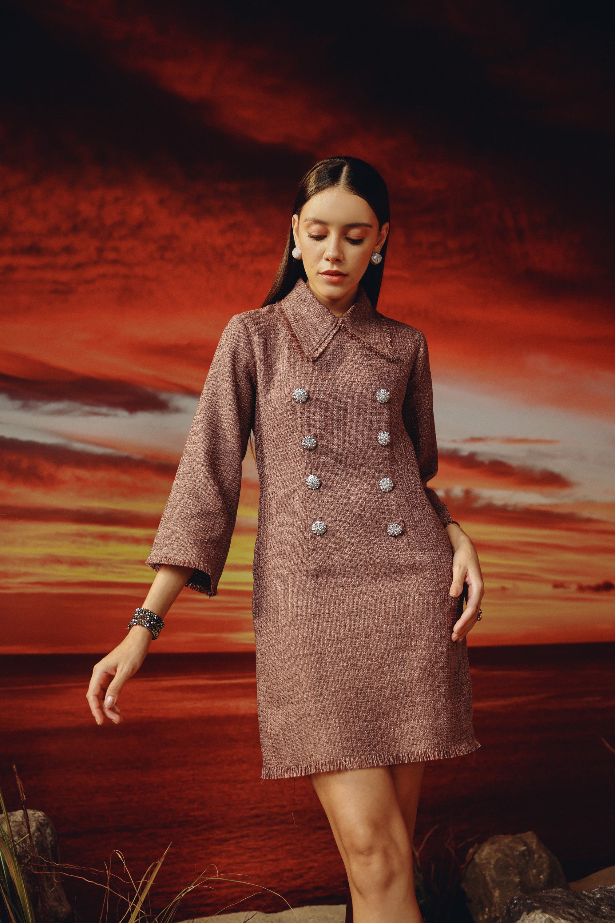Short tweed dress -embellished with rhinestone buttons -functional side pockets -extended peter pan collar -frayed edges.