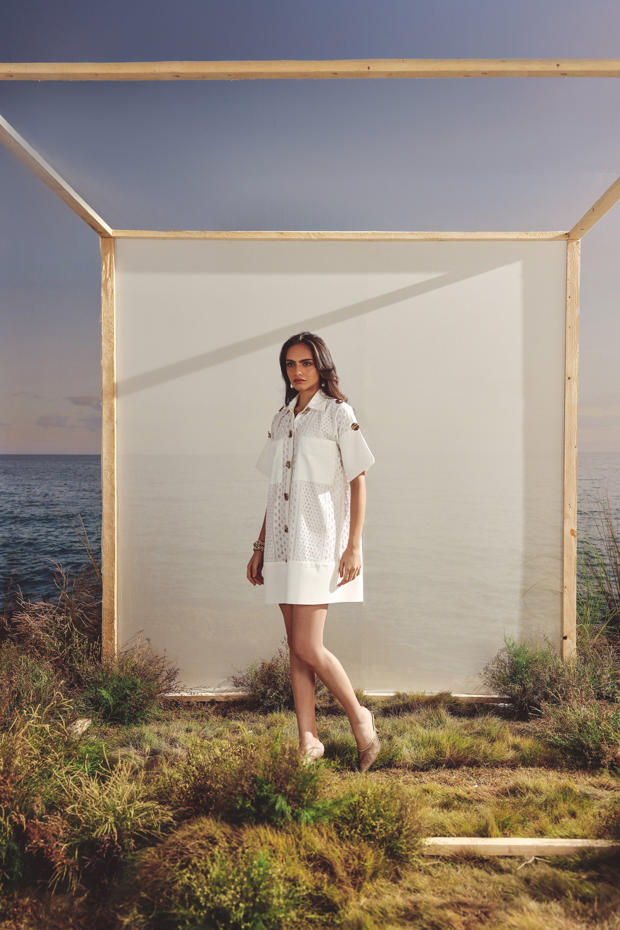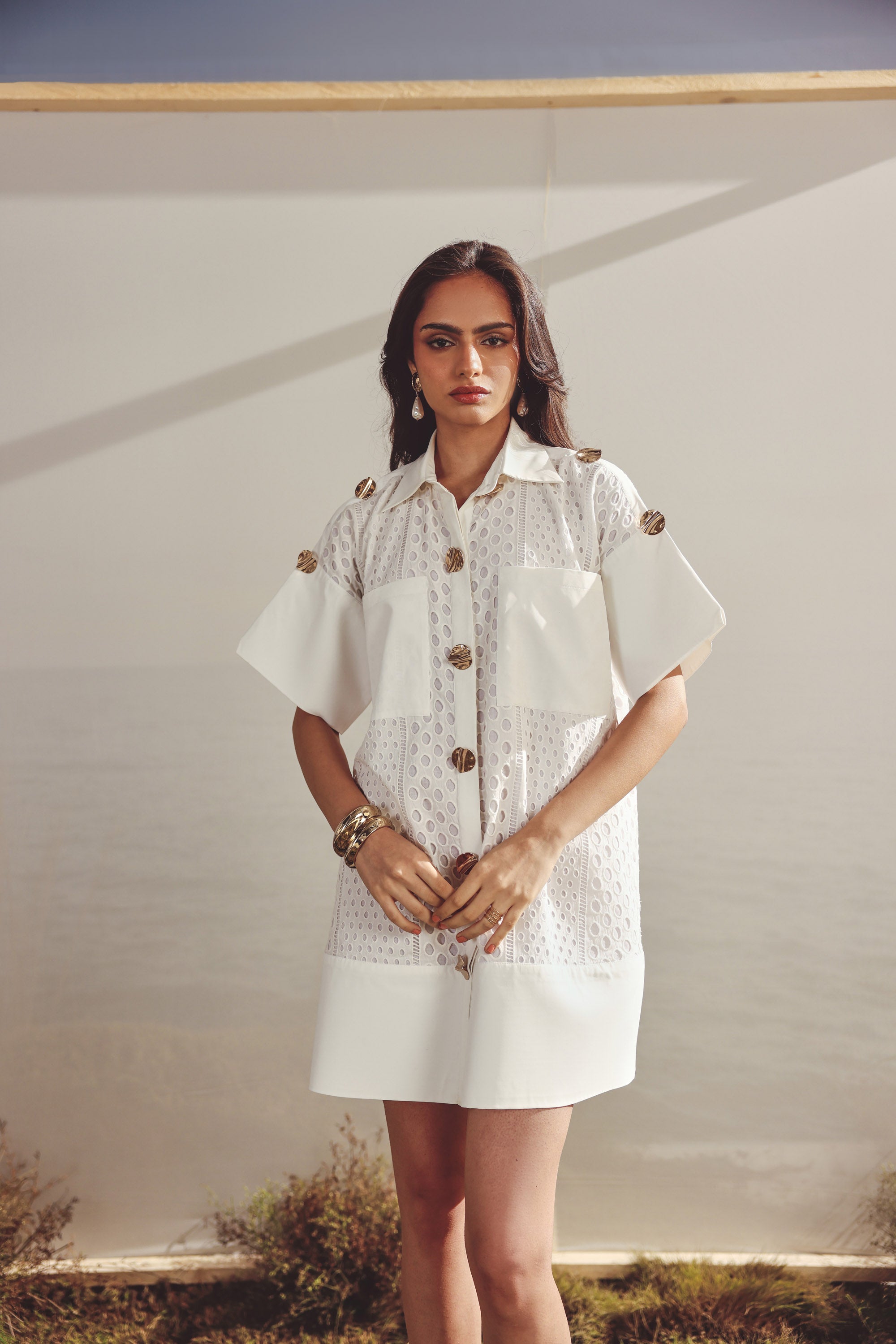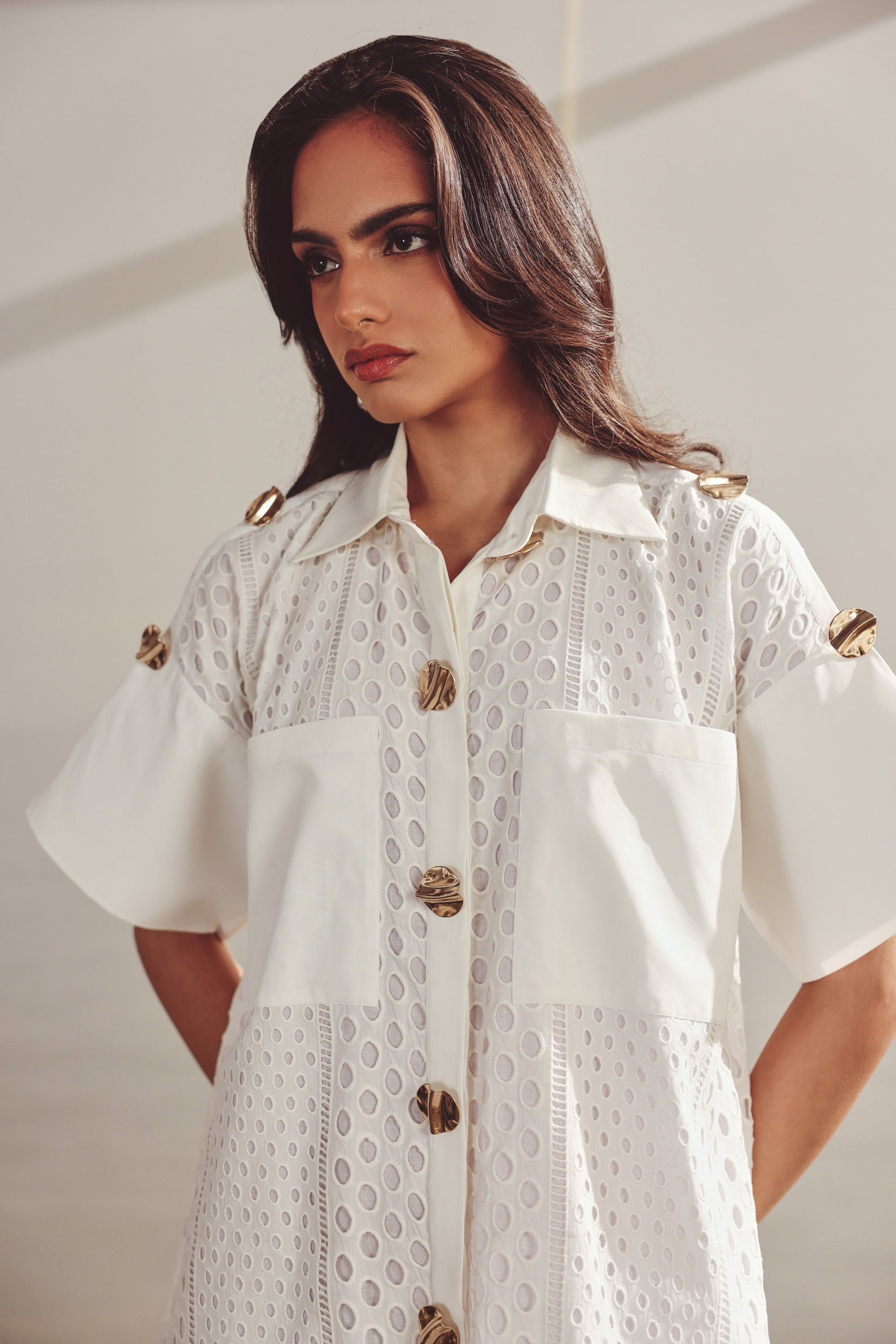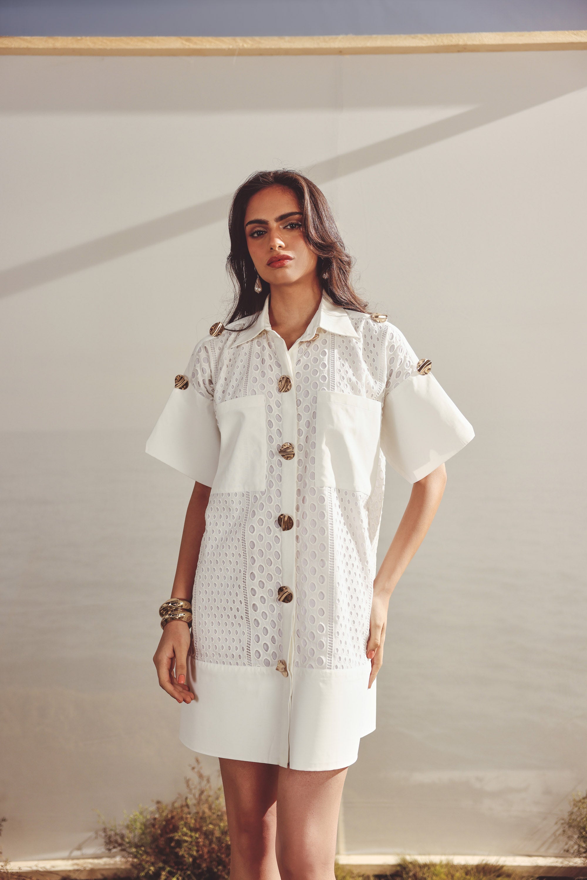 White cotton button down dress with pockets and gold buttons. Front button closure, patch pockets, cotton lining inside for added comfort and gold toned buttons for a touch of glam.