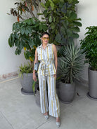 Lurex linen co-ord set with patch pockets and belt. Sleeveless button down top, gold toned buttons to add a touch of refined charm, patch pockets on the waist and chest, comes with a waist cinching belt, high waisted tailored trousers with hook and zip closure