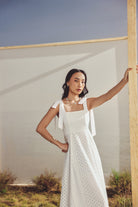 White cotton midi dress with tie up straps. Cotton E2lining inside for added comfort, smocked back, fit and flare Silhouette and finished with delicate straps.