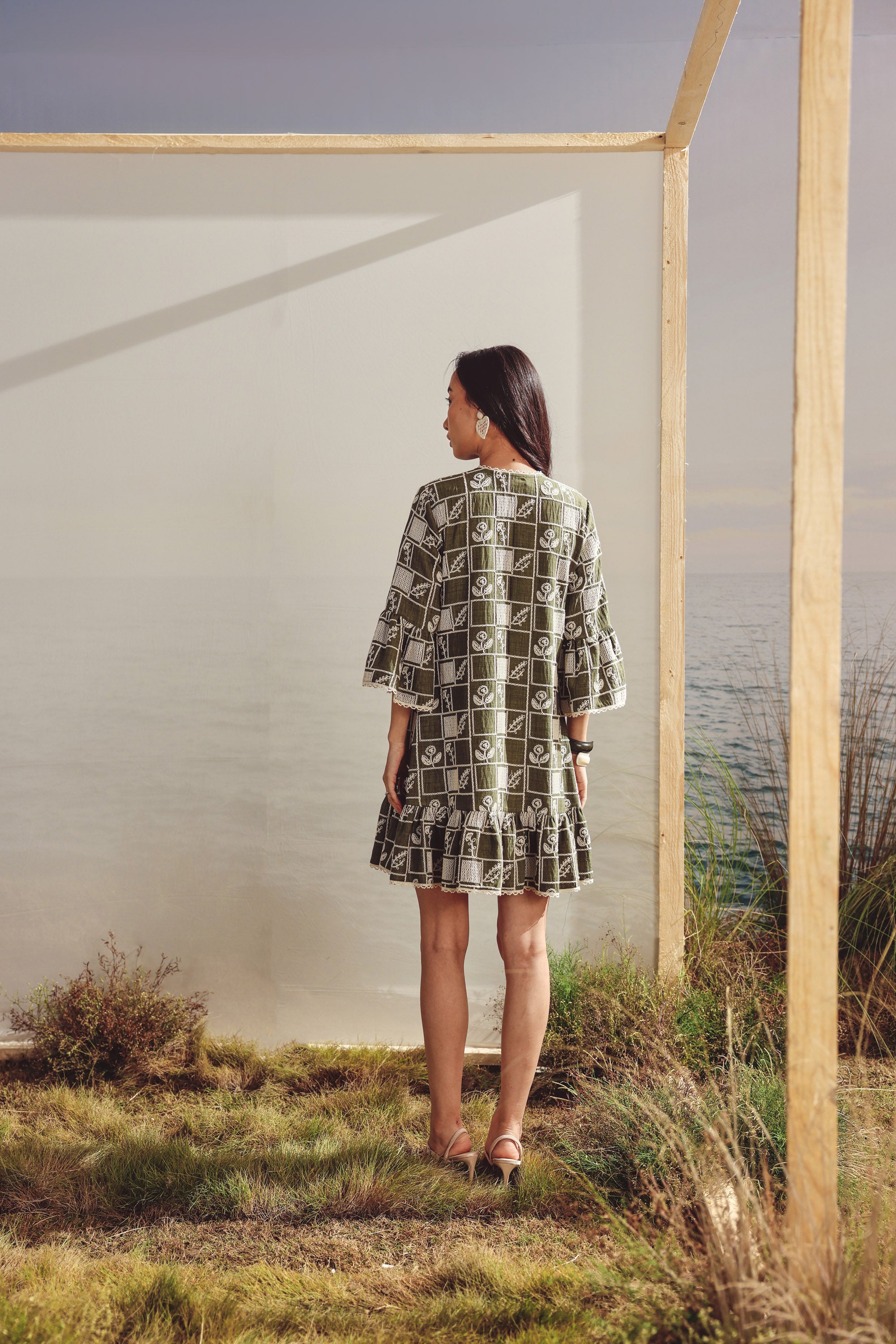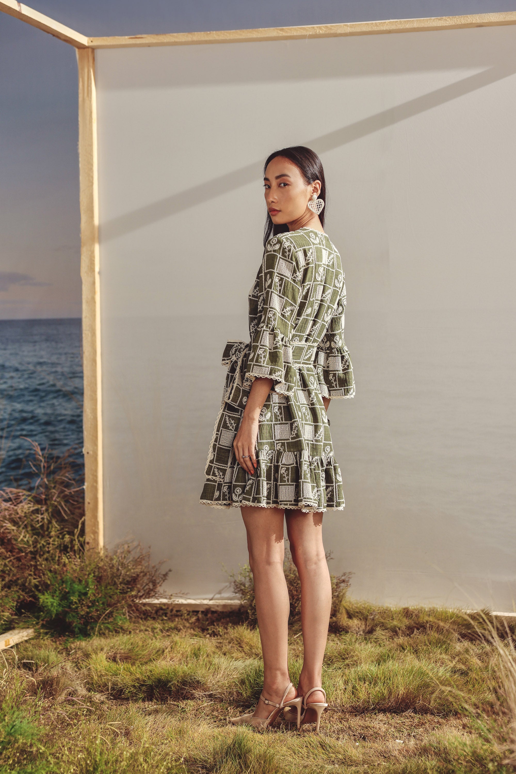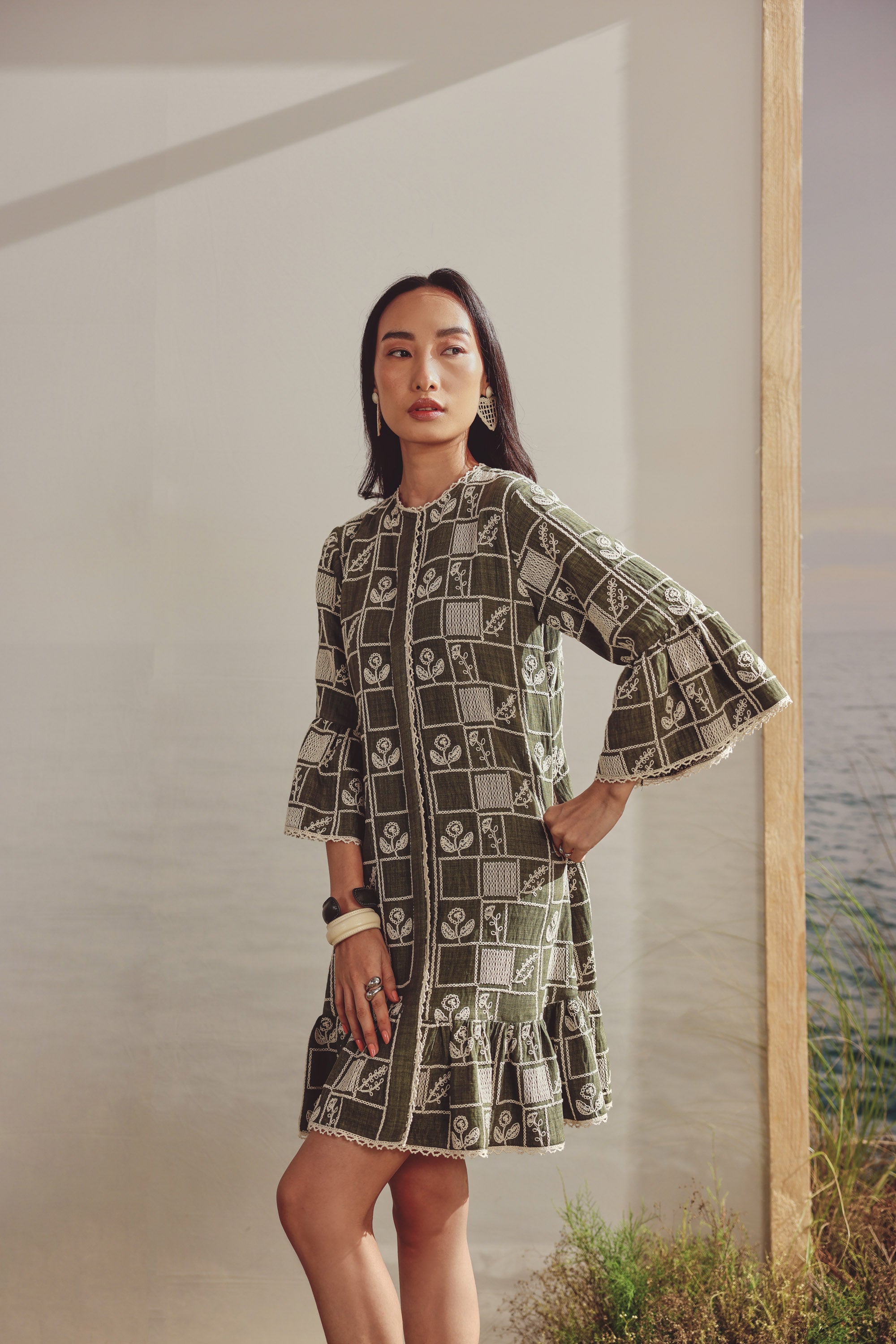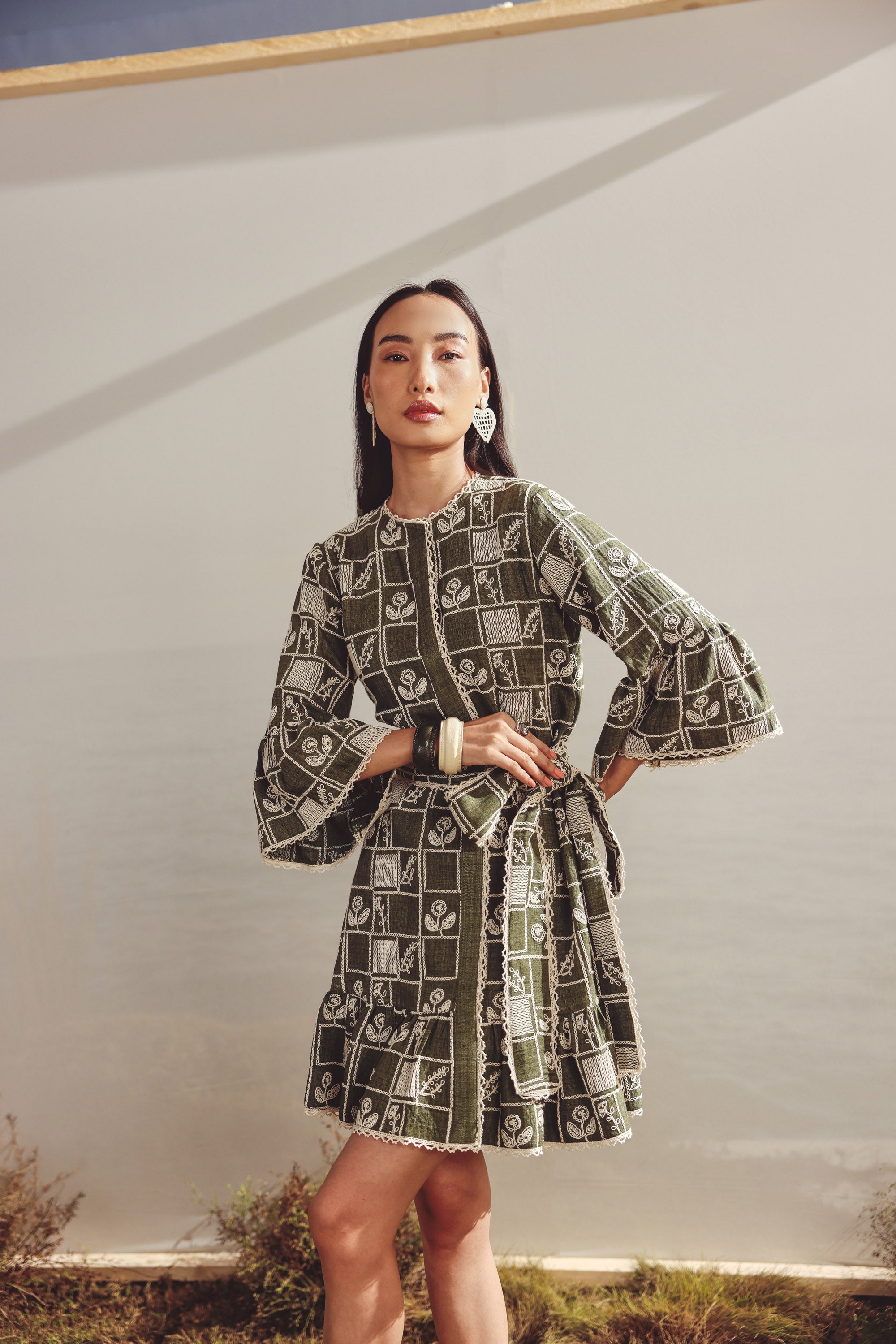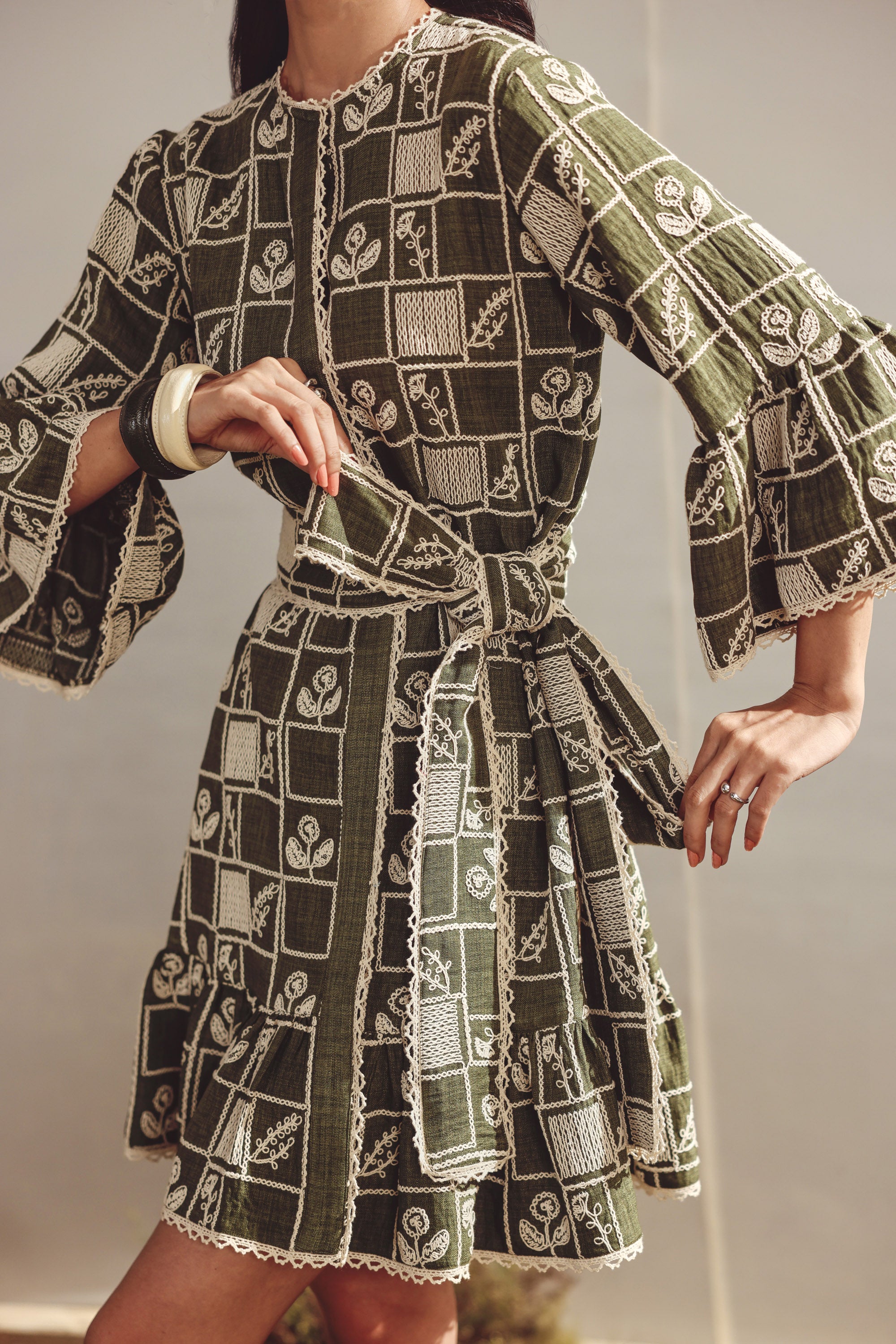 Embroidered short dress with lace (can buy with or without the belt). Intricate embroidery, concealed placket, relaxed fit, added belt for a more cinched look and lace details.