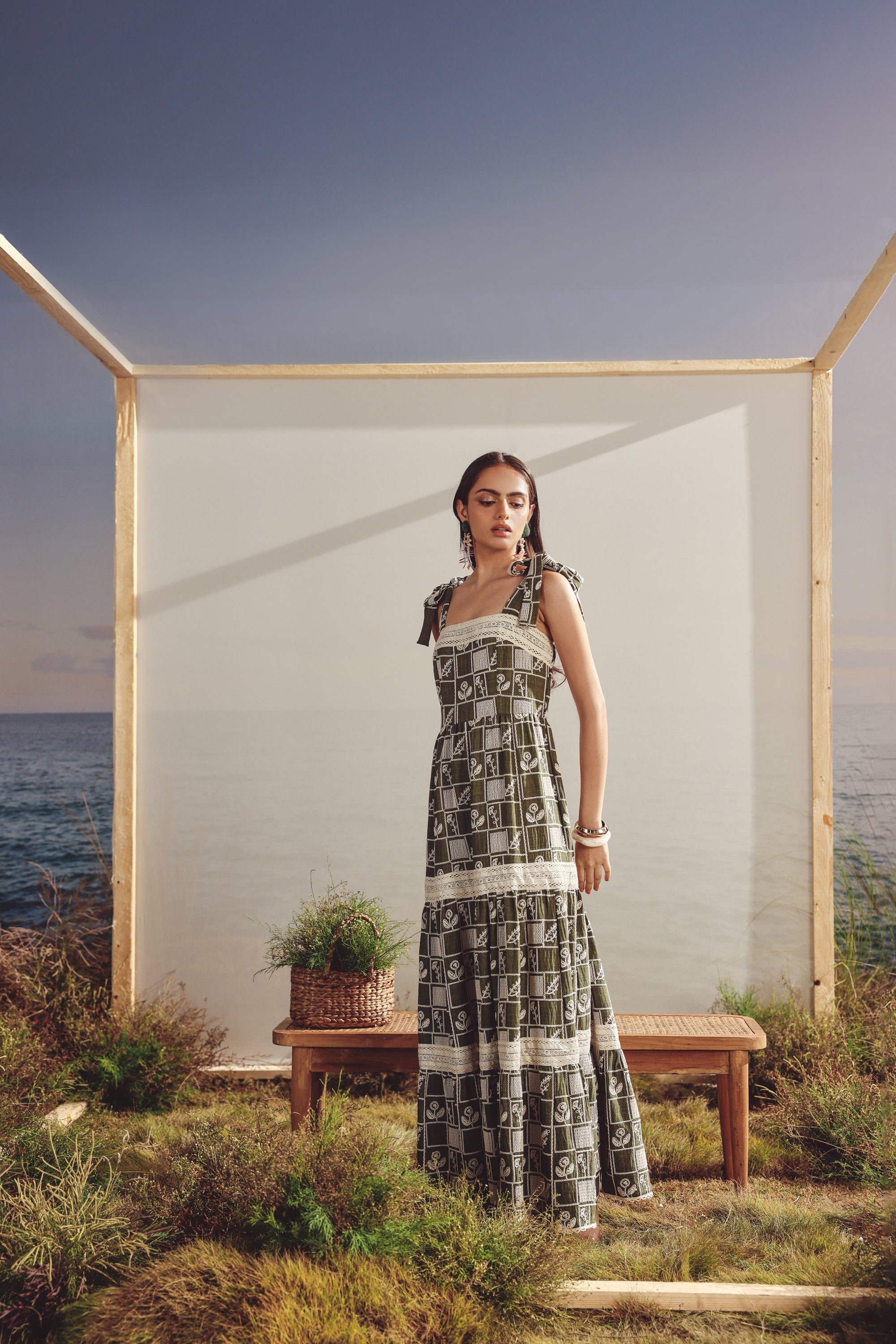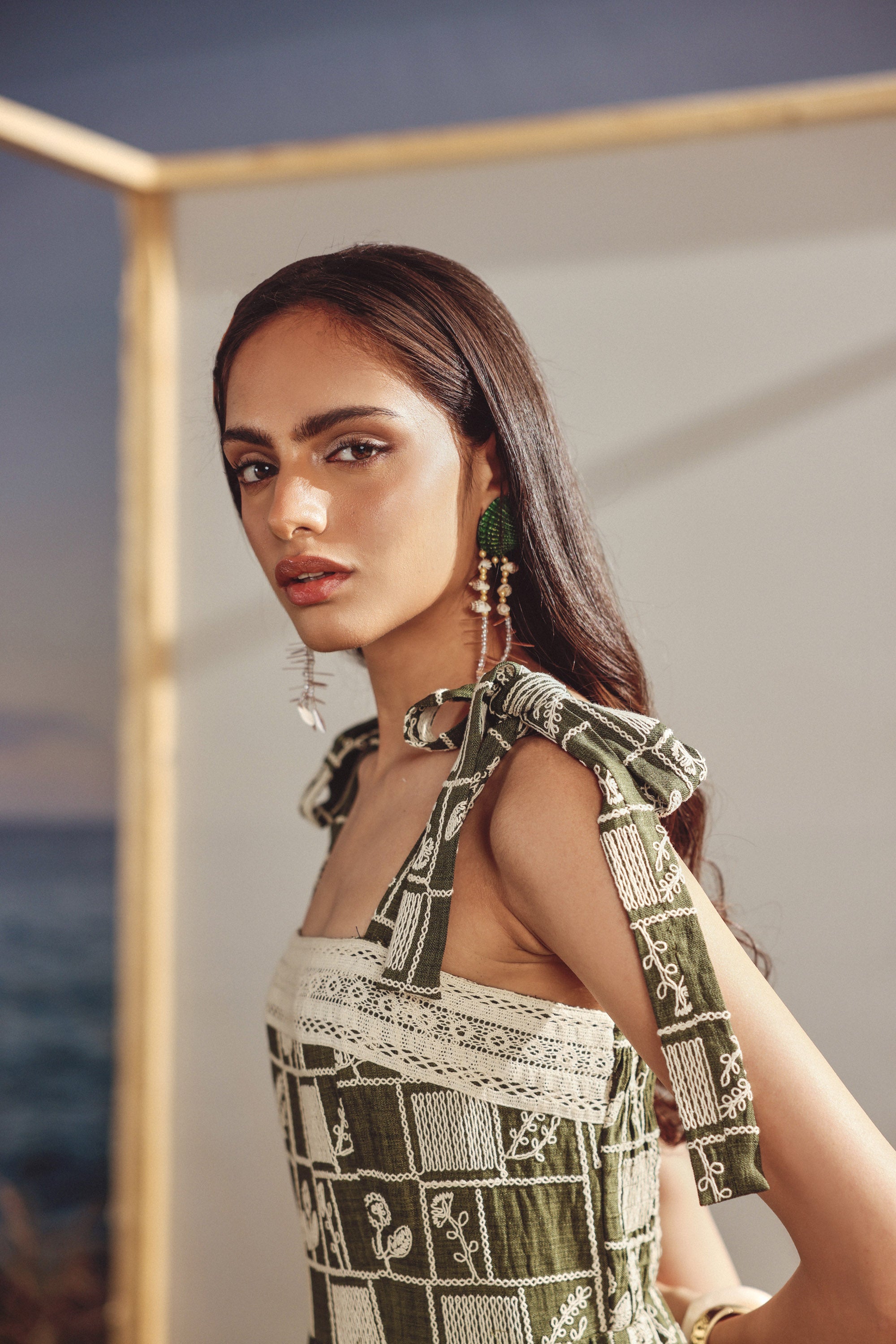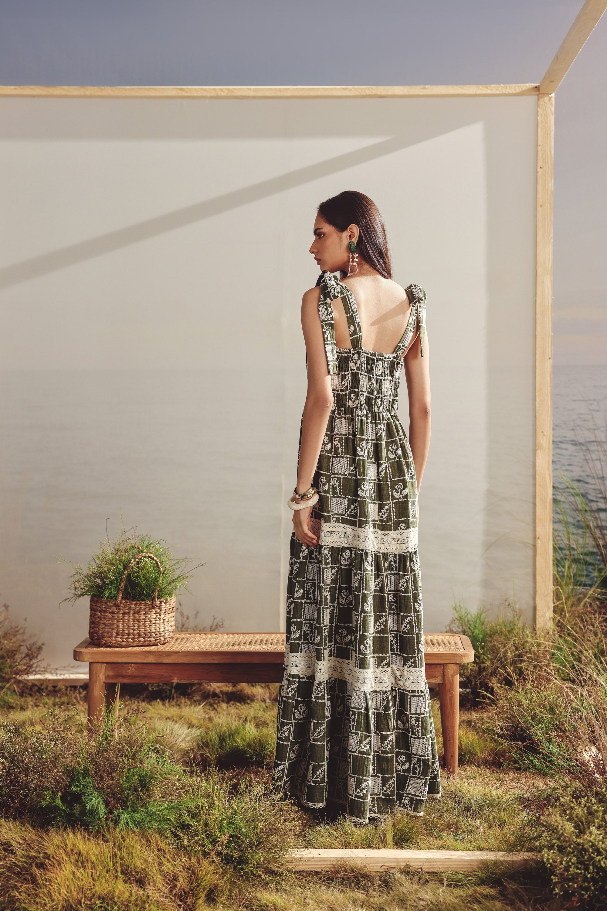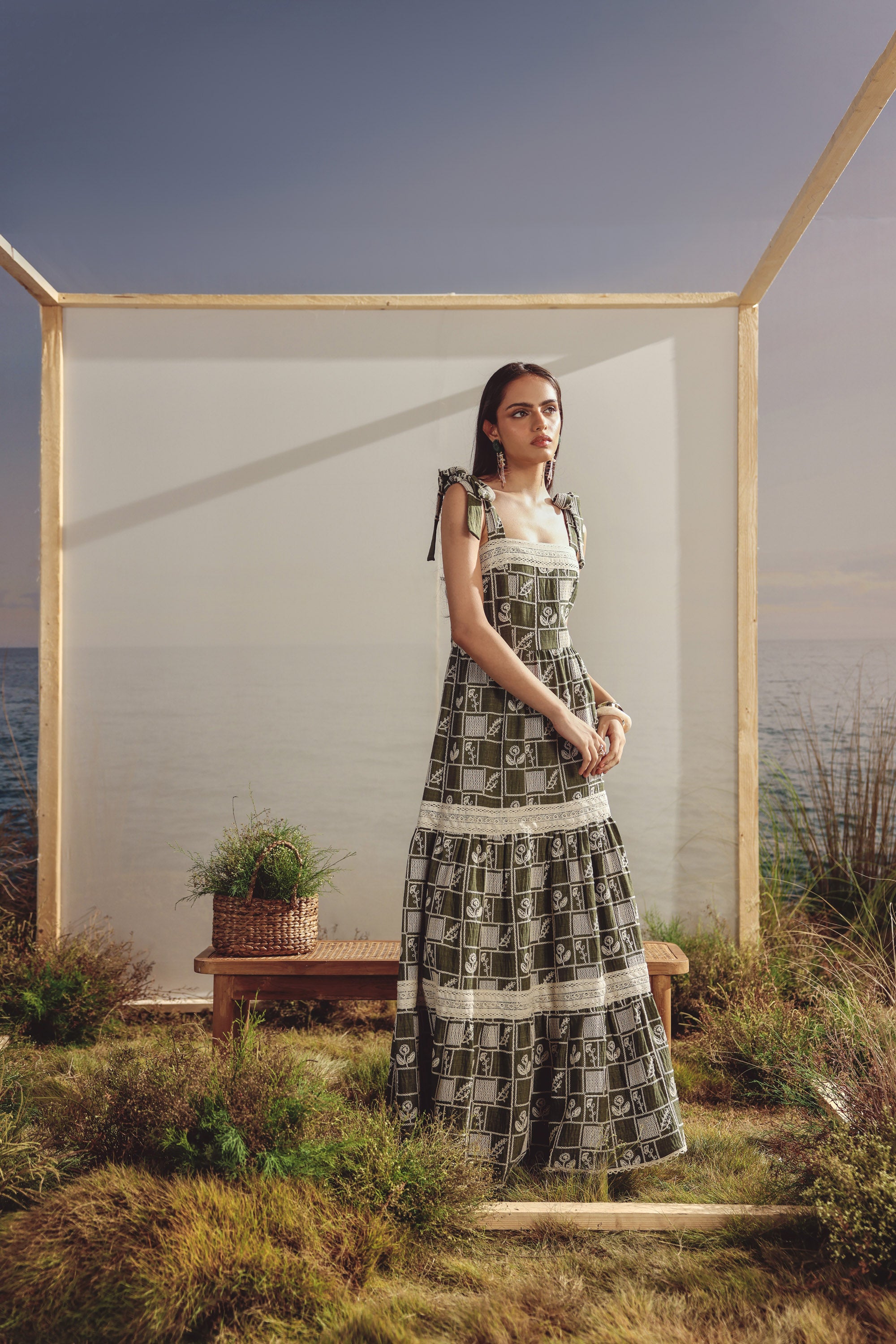 Embroidered midi dress with lace and tie up straps. Intricate embroidery, smocked back, delicate straps, lace details, fit and flare silhouette