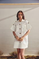 White cotton button down dress with pockets and gold buttons. Front button closure, patch pockets, cotton lining inside for added comfort and gold toned buttons for a touch of glam.