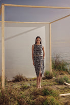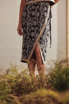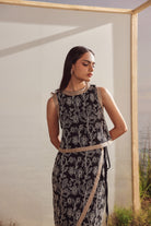 Embroidered crop top with wrap around skirt. Intricate embroidery, crop top finished with contrasting linen trims, wrap around skirt, side slit to add a playful touch and flattering fit.